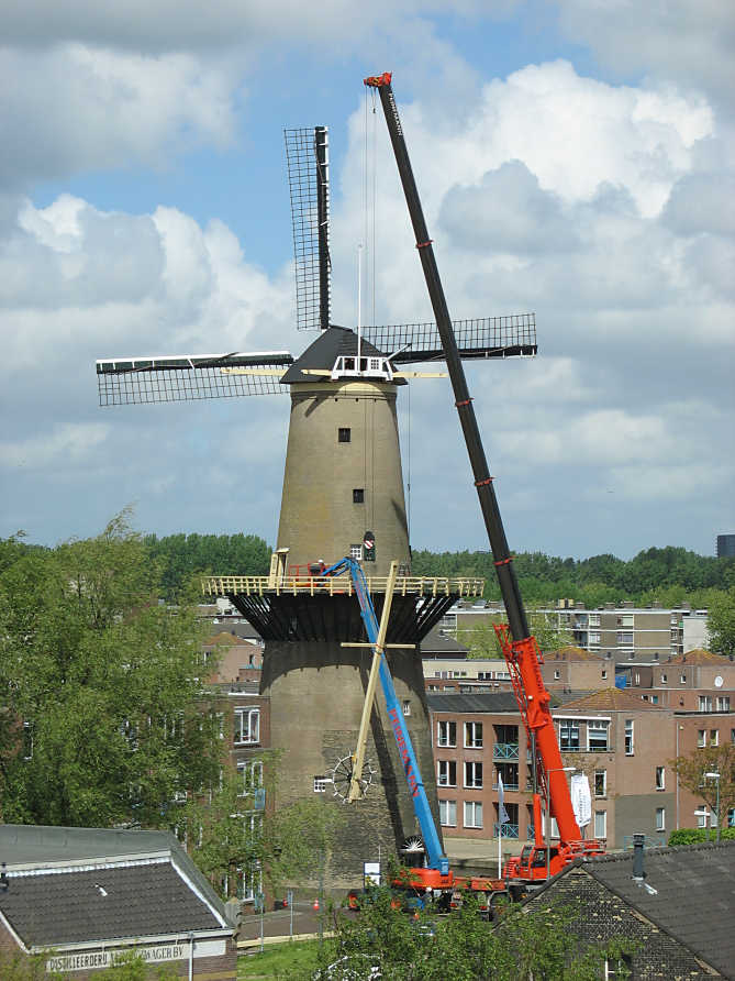 De monumentale Schiedamse brandersmolens krijgen regelmatig een onderhoudskeuring. Daarbij bleek dat de staartbalk en enkele andere onderdelen van de staart van De Nieuwe Palmboom aan vervanging toe waren. Deze week was het zover en werden ze m.b.v. een telescoopkraan er af gehaald. De Museummolen hoeft het maar even zonder staart te stellen. Naar verwachting worden de nieuwe en gerepareerde onderdelen binnen twee weken weer geplaatst.